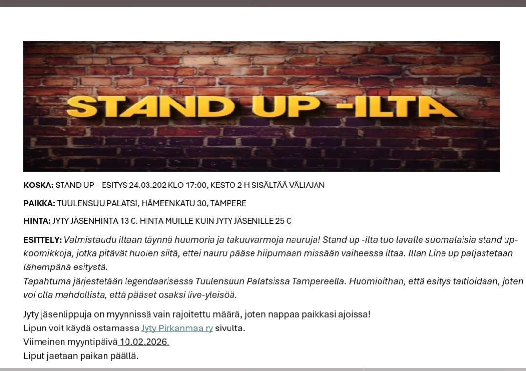 12.1.2023 alkaen Jyty Pirkanmaan soveltuvissa tapahtumissa verkkokaupan kautta voi maksaa nyt myös liikunta/kulttuuriedulla tiettyjä tapahtumia, jotka muutenkin olisivat mahdollisia näillä eduilla.…